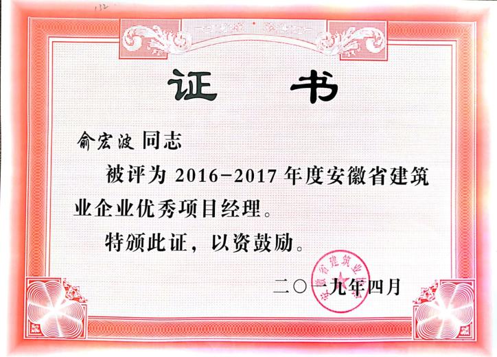 >2016-2017年安徽杏宇娱乐筑业优异项目司理——俞宏波