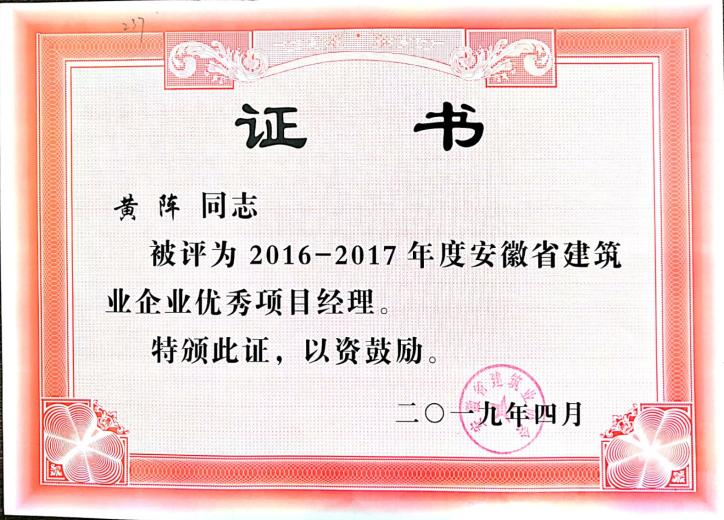 >2016-2017年安徽杏宇娱乐筑业优异项目司理——黄阵