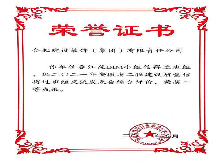 >春江苑BIM小组信得过班组 2021年安徽省工程建设质量信得过班组交流会综合评价二等效果