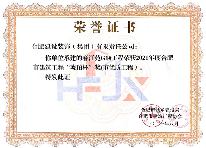 >春江苑G1#--2021年度合肥市修建工程“琥珀杯”奖(市优质工程)