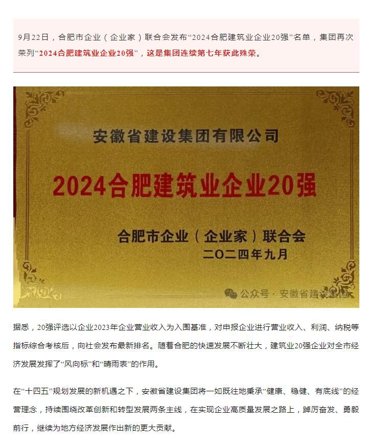>集团一连七年荣登“合肥修建业企业20强”榜单